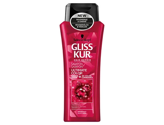 Formula Gliss Kur cu ser de keratina regenereaza daunele existente si previne daunele viitoare. Șampon Ultimate Color pentru păr vopsit, tonifiat sau evidențiat, cu tehnologia 3D-Color-Luminance, închide și întărește fibrele de păr pentru un efect împotriva estompării culorii, strălucirea și protecția culorii timp de până la 12 săptămâni.